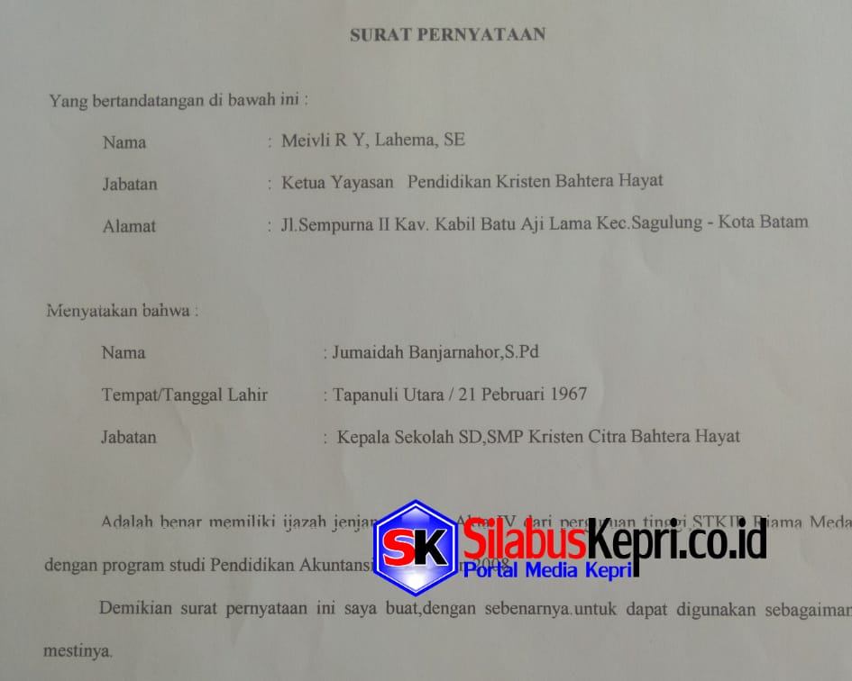 Silabuskepri.co.id, Batam — Tudingan kepada Jumaidah Spd, Kepala Sekolah SD/SMP Citra Bahtera Hayat Sagulung diduga memiliki izasah “Bim Salabin” tanpa melalukan proses belajar mengajar untuk mengejar sertifikasi guru menjadi perhatian public yang patut diusut dan ditindak-lanjuti pihak terkait.