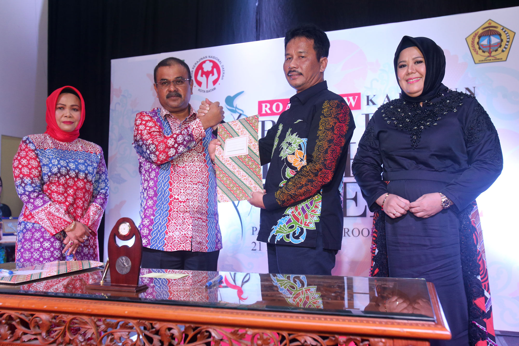 MoU Kerjasama ditandatangani oleh Walikota Batam, Muhammad Rudi dan Bupati Tanjung Balai Karimun, Aunur Rafiq. Ketua Umum Dekranasda Kabupaten Tanjung Balai Karimun, Raja Azmah menyambut baik Roadshow BBFW yang digelar di Karimun.(Humas)